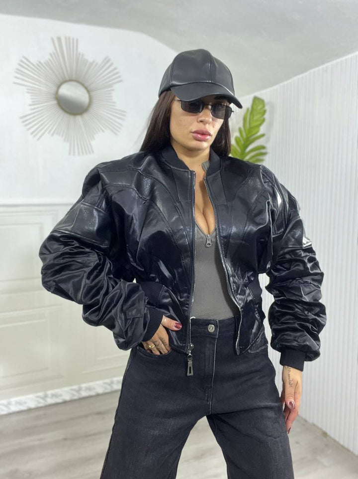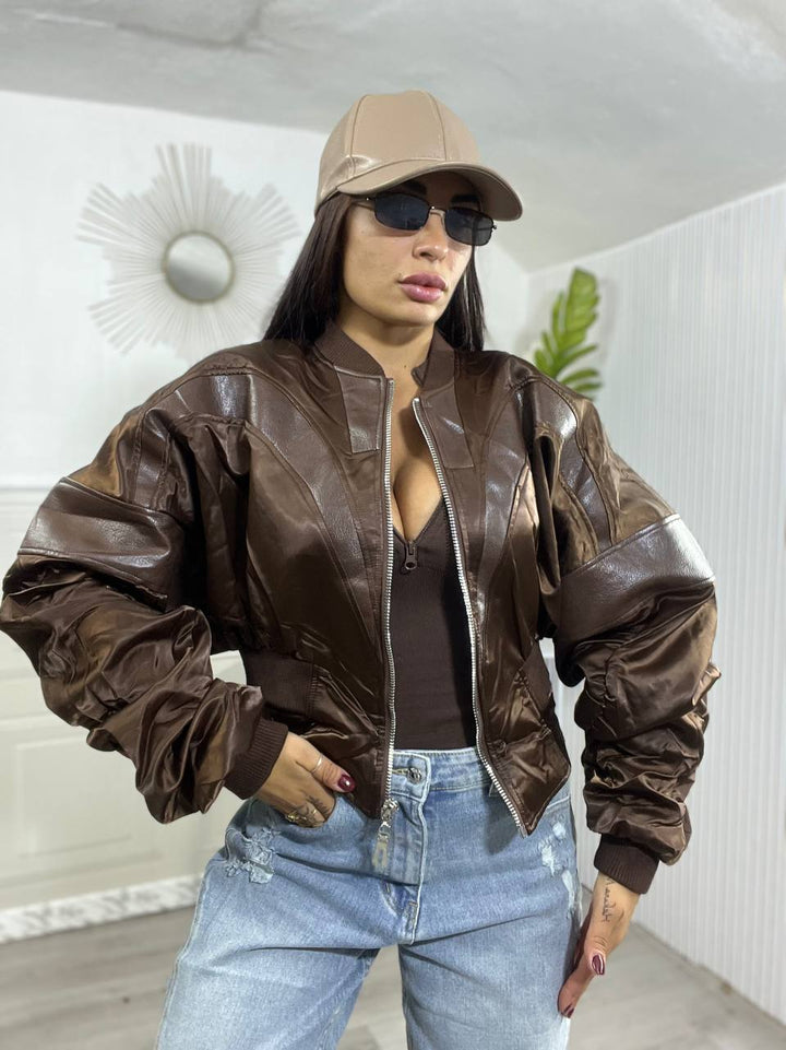 GIUBBOTTO IN RASO CON INSERTI IN PELLE ARRICCIATO SULLE MANICHE