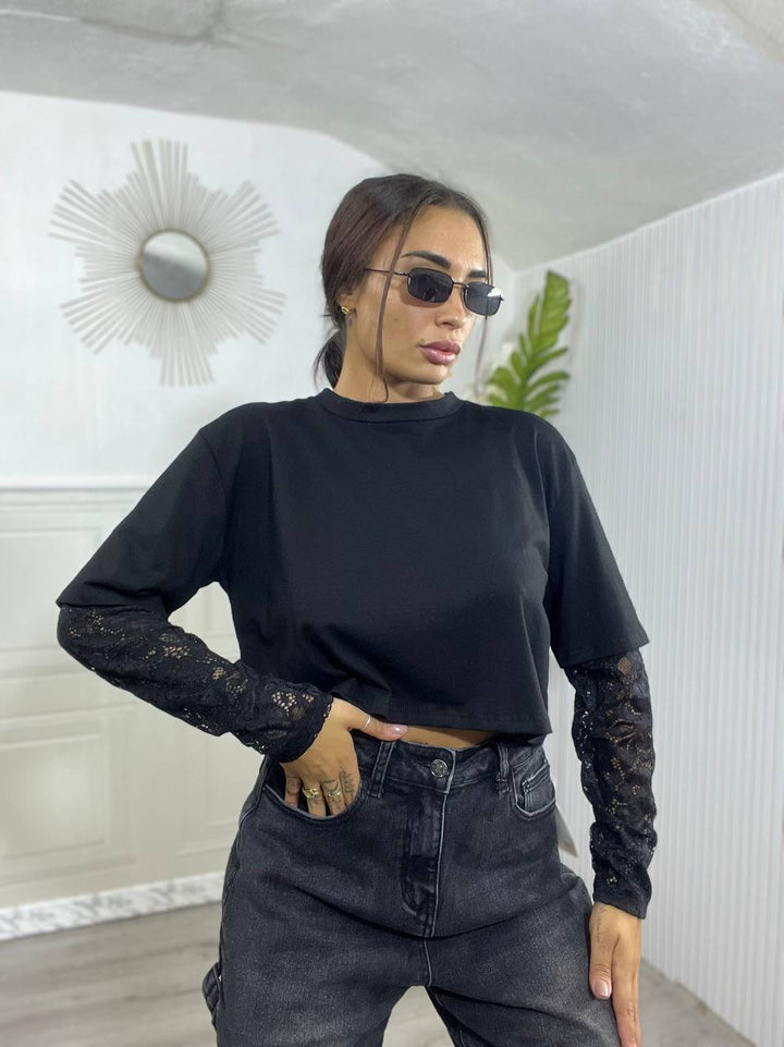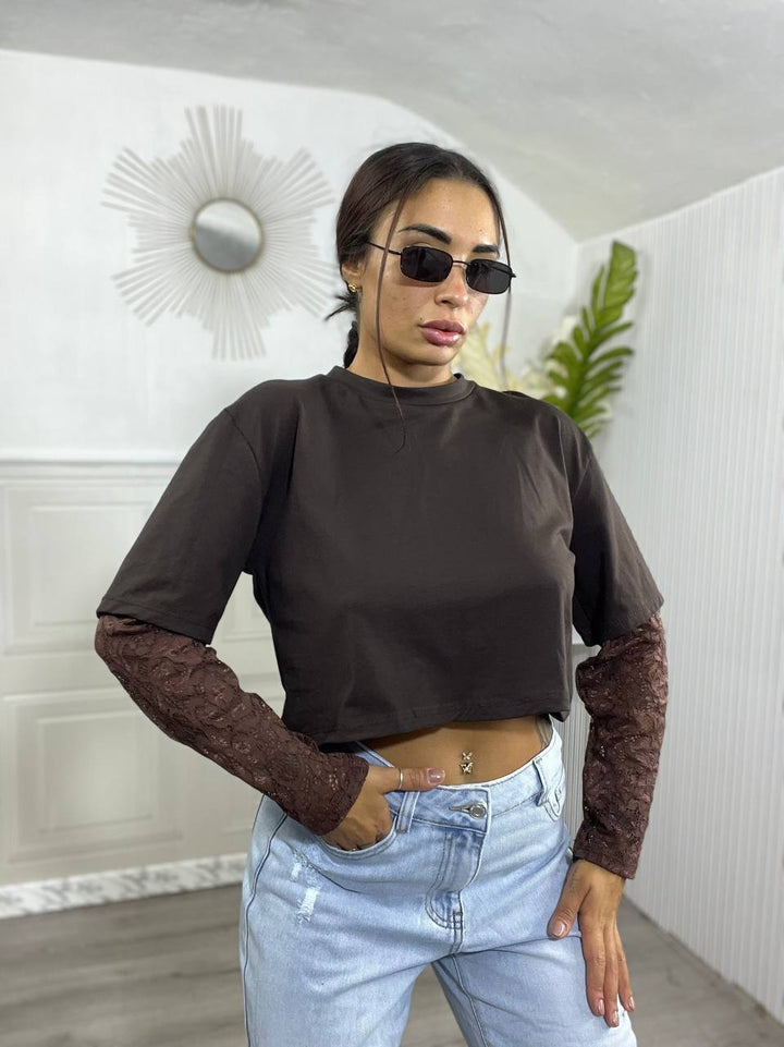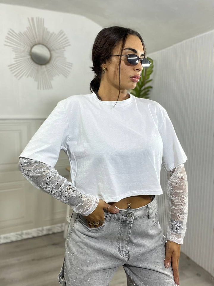 T-SHIRT CROP CON MANICHE IN PIZZO